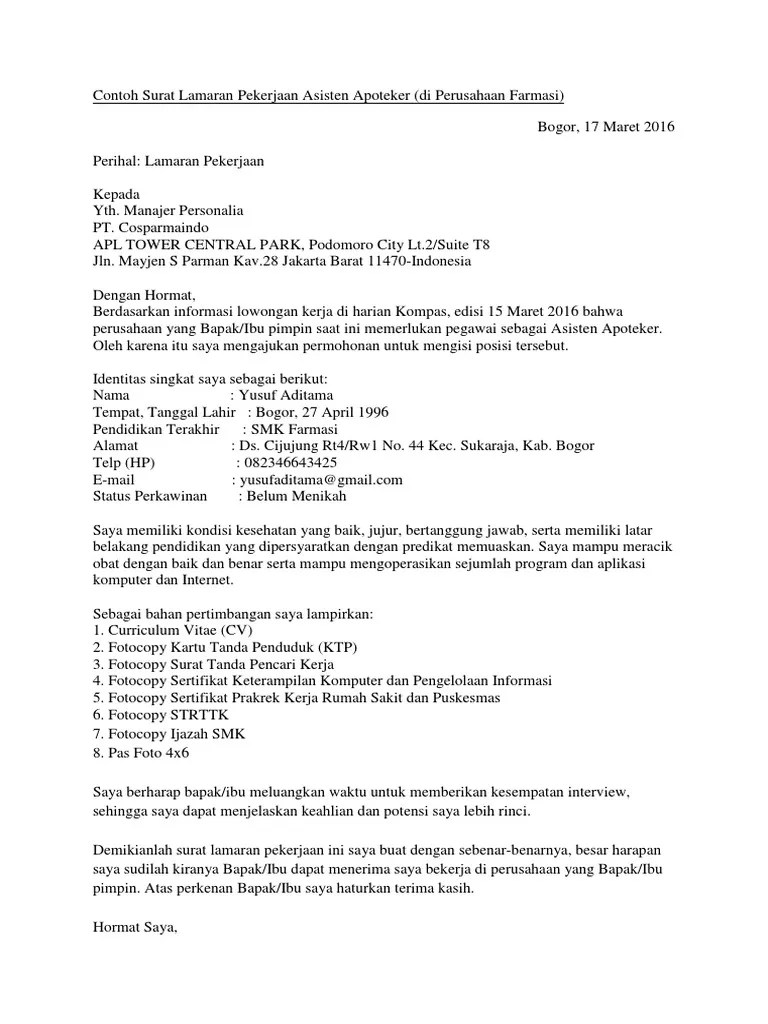 Pengalaman kerja dan skill 7. Bagi anda yang baru saja menamatkan pendidikan dan mulai melamar pekerjaan, maka penting untuk mengetahui bagaimana cara buat surat lamaran . Misalnya melamar pekerjaan di rumah sakit, bank, sekolah, hotel, perusahaan atau pt. Apoteker merupakan pekerjaan yang bergerak dalam bidang farmasi, yang lebih mengkhususnya dalam pada jenis pengobatan untuk para pasien di rumah sakit. Maka dari itu saya akan memberikan beberapa contoh surat lamaran kerja . Berdasarkan inforasi yang sata peroleh bahwa instansi farmasi yang bapak/ibu pimpim saat ini memerlukan pegawai sebagai asisten apoteker. Bersama dengan surat lamaran pekerjaan yang telah saya buat ini, saya mengajukan diri agar bisa bergabung di perusahaan pt. Nah di bidang industri farmasi sendiri, profesi apoteker sangat berperan. "farmasi" mempelajari di bidang penemuan, pengembangan, produksi, pengolahan, peracikan, dan distribusi obat. Informasi lowongan kerja yang saya baca di situs resmi pt. Rekomendasi surat lamaran pekerjaan, mari kita simak contoh berikut ini:. Mungkin tempat inilah yang menjadi favorit bagi pencari kerja untuk lulusan jurusan farmasi. Contoh surat lamaran kerja di perusahaan seringkali dicari oleh para pencari kerja yang ingin mengajukan lamaran .
